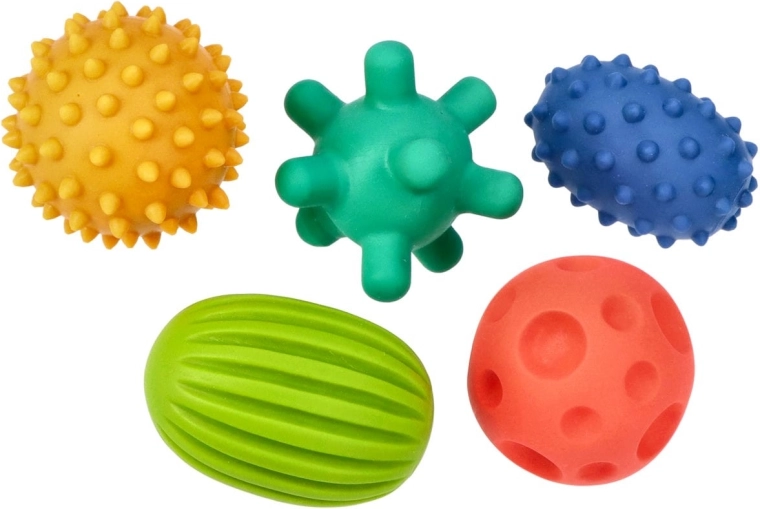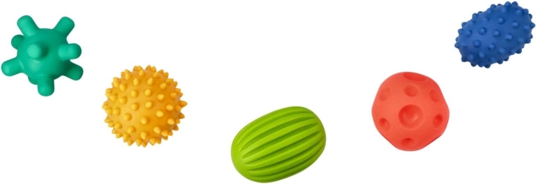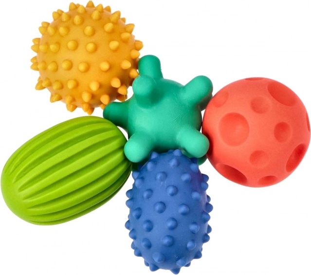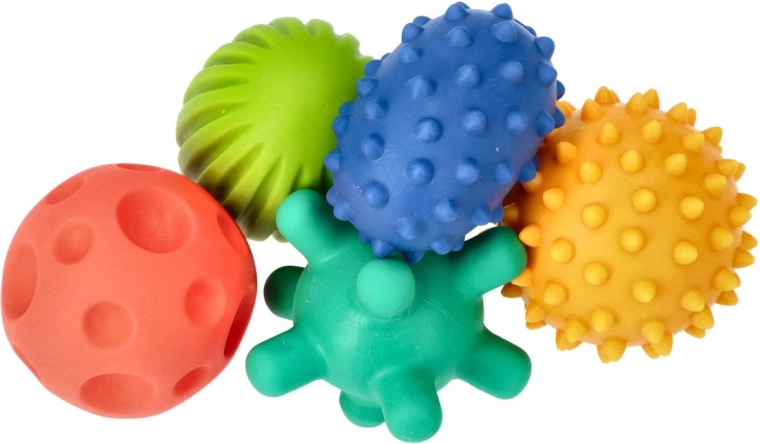 Zestaw zawiera 5 piłeczek sensorycznych o różnych rozmiarach i z różnymi wypustkami.