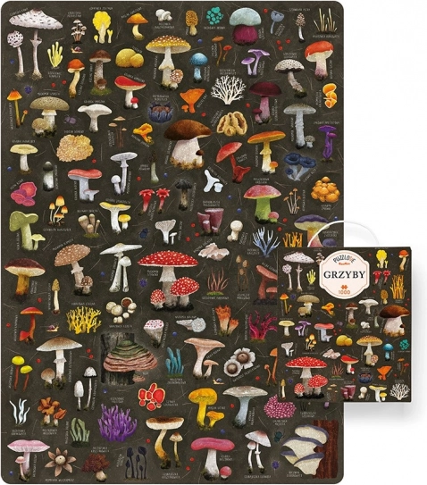 Puzzle Puzzlove Grzyby 1000 elementów prezentują bogato ilustrowaną kolekcję leśnych grzybów – od znanych gatunków po ciekawostki o niezwykłych nazwach. Świetnie sprawdzą się na chwile odpoczynku po spacerze oraz do wspólnego układania z przyjaciółmi. Ćwicz cierpliwość, wytrwałość i spostrzegawczość, które przydadzą się także podczas prawdziwego grzybobrania.