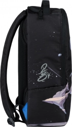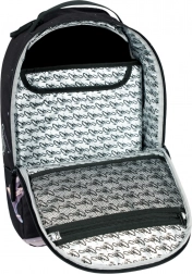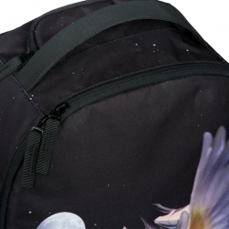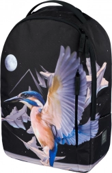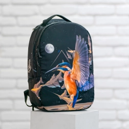 Projekt plecaka zdobi motyw zimorodka w locie, wraz z abstrakcyjnymi kształtami i księżycem. Ten wyrazisty nadruk czyni plecak centrum uwagi.