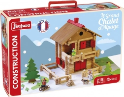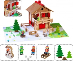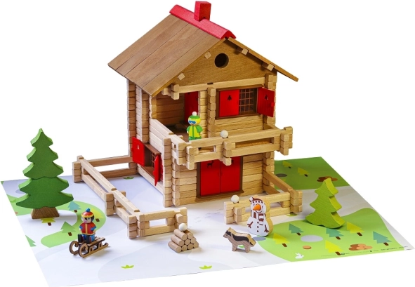 Ta tradycyjna drewniana konstrukcja nawiązuje do kultowych francuskich zestawów JEUJURA. Solidne, zrębowe belki i kolorowe detale pozwalają dzieciom łatwo zbudować dużą alpejską chatę i odegrać zimowe historie na tematycznej planszy. Każdy element jest przyjemny w dotyku i idealnie dopasowany, dzięki czemu budowanie jest zabawne i intuicyjne.