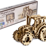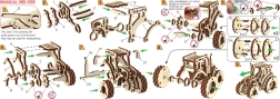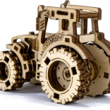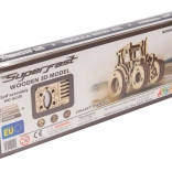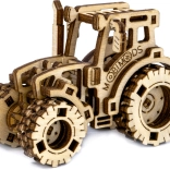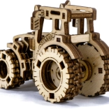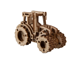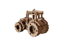Laserowo wycinane części ze sklejki tworzą realistyczny wygląd traktora z zębatkami i oponami.