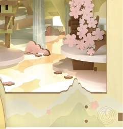 Szczegółowa japońska sceneria z prostym sterowaniem oświetleniem wciąga w opowieść. Na półce wygląda jak małe przejście do świata rozkwitłych kwiatów sakury.