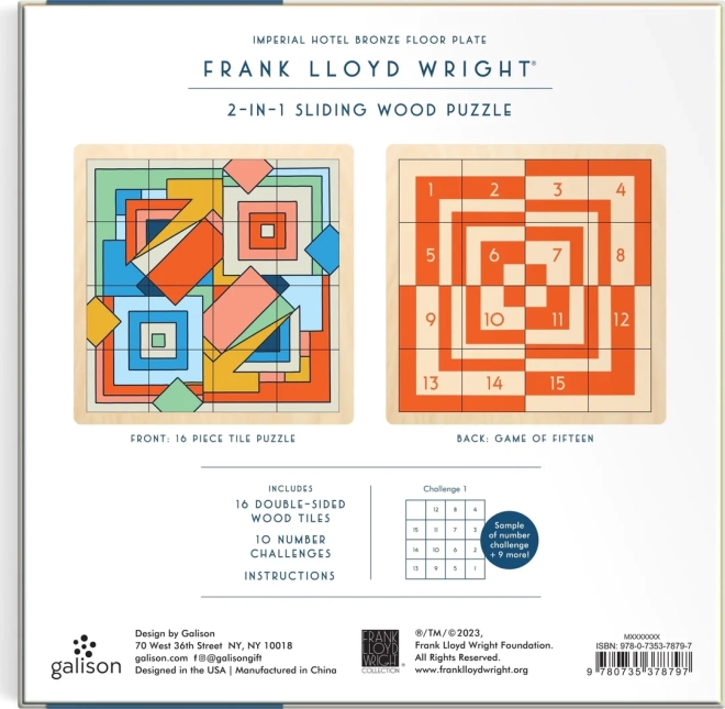 Odkryj ponadczasową estetykę architekta FRANK LLOYD WRIGHT w sprytnej rozrywce planszowej. Te przesuwane drewniane puzzle z motywem wzoru podłogi hotelu Imperial łączą wizualnie efektowny design z logicznym wyzwaniem. Z jednej strony układasz motyw precyzyjnym przesuwaniem elementów, z drugiej zagrasz w klasyczną grę piętnastkę o regulowanym poziomie trudności.