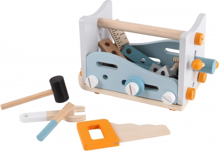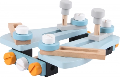 Ta zabawka zawiera narzędzia, takie jak piła, młotek, linijka, śrubokręt i klucz płaski. Oprócz tych narzędzi znajdziesz także wiele śrub, podkładek i drewnianych elementów, które można łączyć i skręcać, zapewniając wiele godzin zabawy.