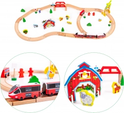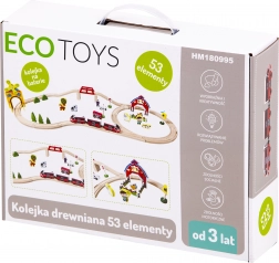 Zestaw zawiera 53 elementy, które umożliwiają dzieciom swobodne układanie różnych scen, a charakter całego kompletu nawiązuje do farmy. Postacie przedstawiające zwierzątka uzupełnione są o farmę i wiatrak, pod którym może przejechać pociąg. Kolejka nie tylko bawi, ale także uczy o życiu na wsi.