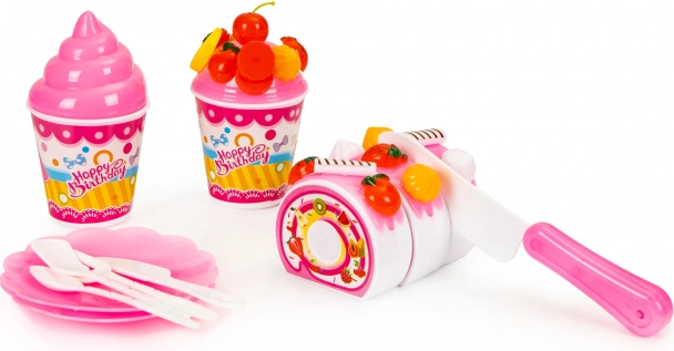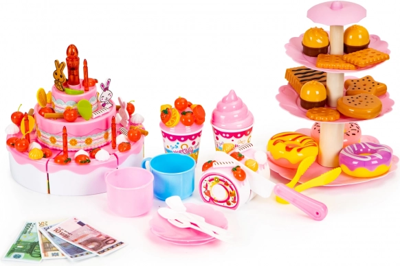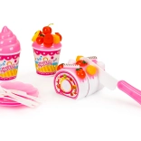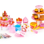 Oprócz tortu zestaw obejmuje różnorodne słodkie akcesoria, które czynią zabawę jeszcze bardziej wciągającą. Zawiera ciasteczka, babeczki, pączki i lody w pucharkach – idealne do kreatywnej zabawy.