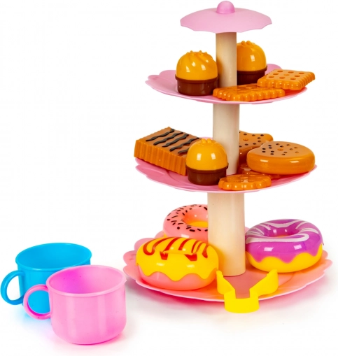 Zestaw zawiera elegancki trzypoziomowy stojak na desery, na którym dzieci mogą umieszczać wszystkie słodkości. To idealny dodatek do organizacji fikcyjnych przyjęć i podwieczorków.