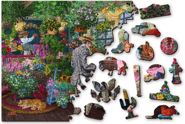Stylowe drewniane puzzle z motywem tętniącej życiem kwiaciarni ucieszą miłośników dopracowanych ilustracji i bardziej wymagających układanek. Dzięki dwustronnemu wykonaniu zyskujesz dwie układanki w jednej – awers z kolorową sceną pełną kwiatów oraz rewers ze wzorem do układania według kształtów. Unikalne wykroje w kształcie zwierząt, postaci i przedmiotów działają jak małe figurki i nadają układaniu nowy wymiar.