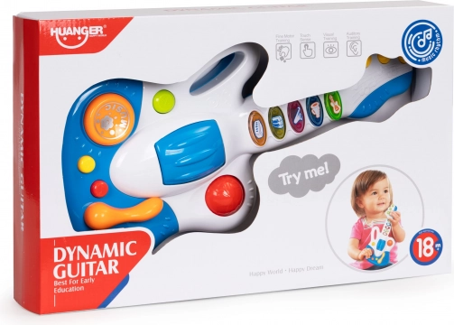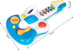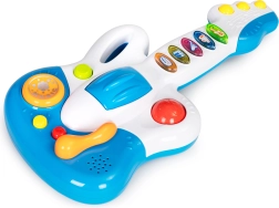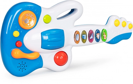 Gitara jest wyposażona w 5 kolorowych przycisków, każdy z innym dźwiękiem lub melodią. Dodatkową atrakcją jest obrotowa kulka, która działa jak grzechotka.