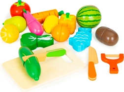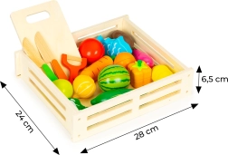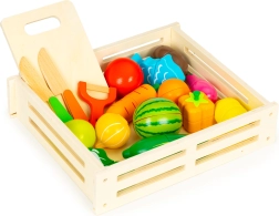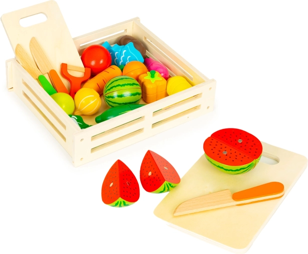 - Pudełko, deska do krojenia, 2× nóż (imitacja), obieraczka (imitacja), różne sztuki owoców i warzyw