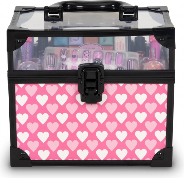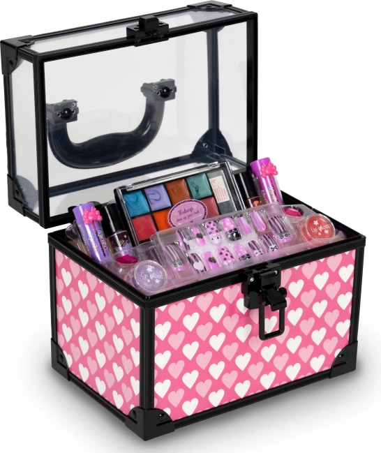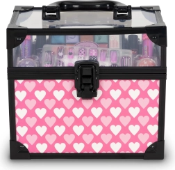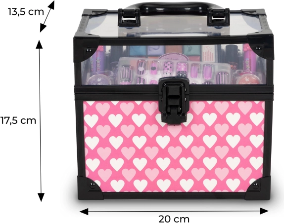 Walizeczka z przezroczystą pokrywą utrzymuje wszystko przejrzyście uporządkowane, a dzięki kompaktowym wymiarom łatwo ją przenosić. Zestaw zawiera błyszczyki do ust, lakiery do paznokci, pomadki, paletę żelowych cieni do powiek, pierścionki oraz zestaw przyklejanych paznokci – idealne wyposażenie do twórczego makijażu i rozwoju wyobraźni.