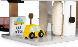 Garaż wykonano z trwałego drewna i wyposażono w gładkie, bezpieczne krawędzie. Bogaty zestaw akcesoriów, w tym myjnia oraz stacja paliw, pobudza dziecięcą wyobraźnię i wydłuża czas zabawy. Idealny prezent dla dzieci od 3 lat, wspierający rozwój motoryki, koordynacji i logicznego myślenia.