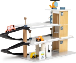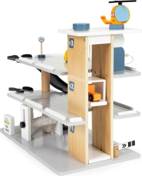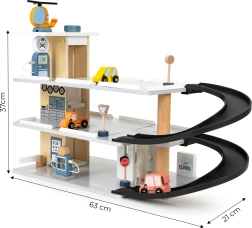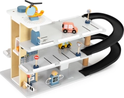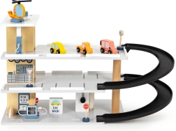 Ten wielopoziomowy drewniany garaż tworzy dla dzieci prawdziwą strefę akcji: samochodziki mkną po zjazdach między piętrami, zatrzymują się przy znakach drogowych, a dzięki ruchomej windzie łatwo przemieszczają się w górę i w dół. Na dachu znajduje się lądowisko, na którym może wylądować dołączony helikopter.