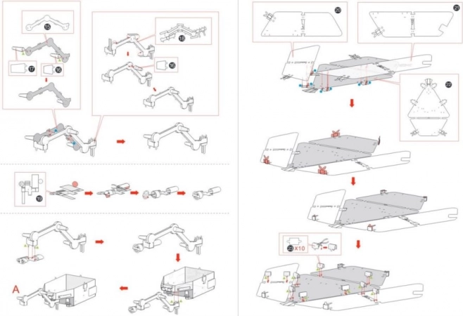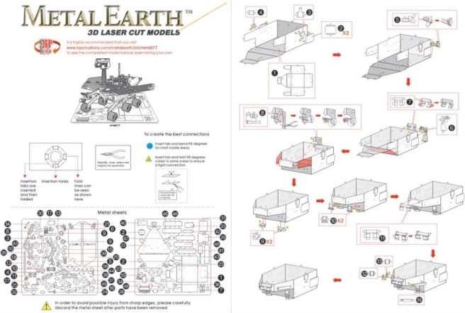 Do złożenia modelu użyj elementów z stalowych blach (11 x 11 cm) i postępuj zgodnie z dołączoną instrukcją. Łącz części za pomocą zaczepów i otworów. Polecamy używać małych, cienkich szczypiec, które nie są częścią zestawu.