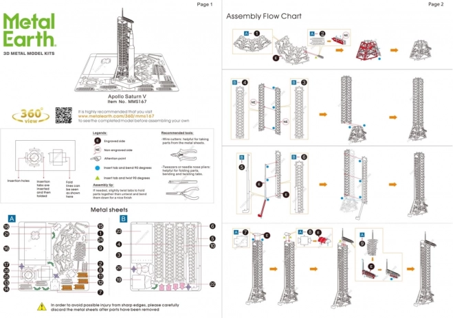 Poszczególne elementy wyjmij z metalowych arkuszy; w razie potrzeby użyj małych cążków do cięcia (nie wchodzą w skład zestawu). Elementy łączy się za pomocą zamków tworzonych przez zaczep (języczek) i otwór. Języczek zegnij przy użyciu małych, cienkich szczypiec (nie wchodzą w skład zestawu) i stopniowo połącz wszystkie zamki, aż powstanie bardzo realistyczne, mistrzowskie dzieło!