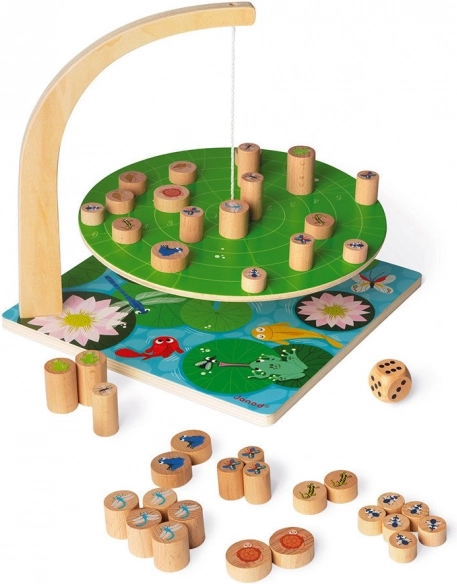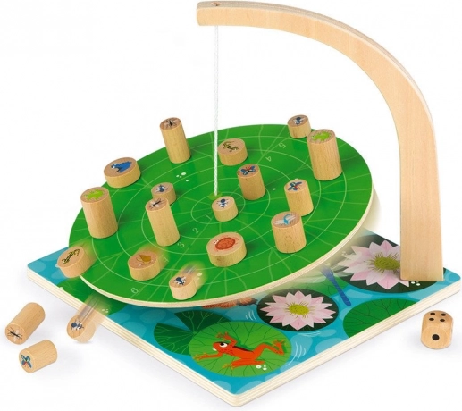 Komu zwierzątka utrzymają się na liściu grzybienia najdłużej? Grzybienie to gra towarzyska rozwijająca umiejętności i małą motorykę. Aby przetrwać w stawie, trzeba działać zręcznie i strategicznie! Ustawiaj figurki zwierzątek na liściu tak, aby się nie przewrócił. Celem gry jest, by zwierzątka nie spadły z liścia grzybienia. Zestaw zawiera drewnianą podstawę z zawieszonym liściem grzybienia, 42 drewniane pionki ze zwierzątkami oraz 1 drewnianą kostkę do gry. Fakt, że podstawa nie jest całkowicie równa, nie ma żadnego wpływu na grywalność produktu. Mała wskazówka: im ostrożniej ustawisz figurkę zwierzątka, tym mniej poruszysz liściem. Gra rozwija: - zręczność i małą motorykę - myślenie strategiczne - koncentrację. Odpowiednia dla dzieci od 6 lat.