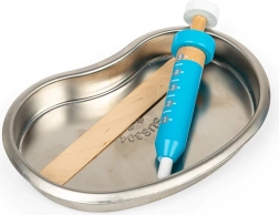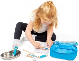 Stylowy, niebieski kuferek kryje wszystko, czego potrzebuje mały dentysta: drewnianą szczoteczkę do zębów, tubę na pastę do zębów, strzykawkę, otoskop, pęsetę, maseczkę, tackę ze stali nierdzewnej, naklejkę oraz schemat prawidłowego czyszczenia zębów. Dzieci mogą bezpiecznie sprawdzić, co je czeka u dentysty, i naturalnie budować pozytywny stosunek do higieny jamy ustnej.