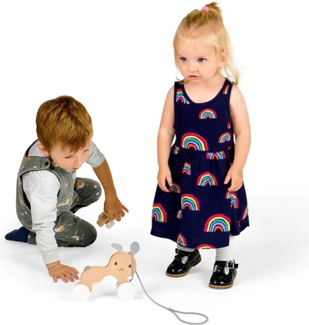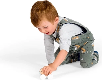 Cztery solidne kółka z geometrycznym wzorem jeżdżą płynnie po równych powierzchniach, a szary sznurek do ciągnięcia dobrze trzyma się nawet w drobnych rączkach. Zabawka pomaga rozwijać zwinność, równowagę i umiejętności koordynacyjne, wspiera aktywność ruchową i wyobraźnię.