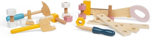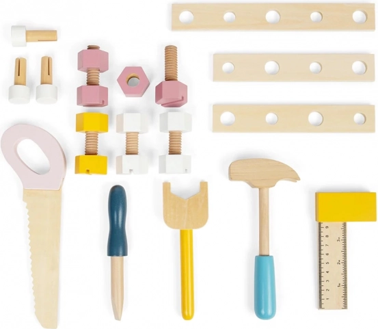 W komplecie znajdują się: piła, klucz, młotek, śrubokręt, kątownik, nakrętki i śruby – wszystko w pastelowych kolorach i gotowe do tworzenia.