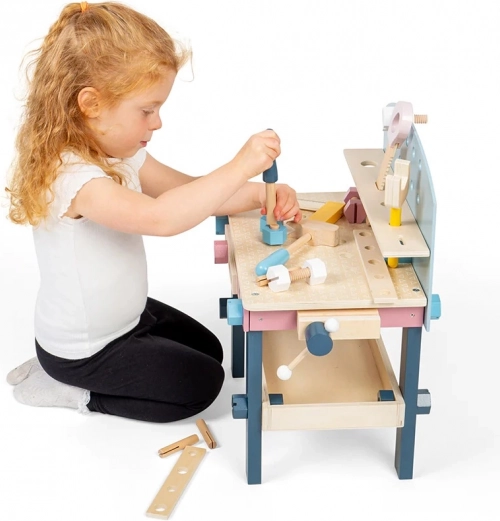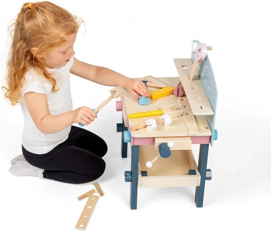 Dziecięcy stół warsztatowy BIGJIGS TOYS zapewnia bezpieczny i inspirujący kącik dla małych majsterkowiczów. Solidna drewniana konstrukcja, przejrzyste schowki i różnorodny zestaw narzędzi zachęcają do poznawania podstaw pracy z narzędziami i pomysłowego budowania.