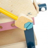 Stylowy drewniany stół warsztatowy dla małych majsterkowiczów wspiera małą motorykę, koordynację ręka–oko oraz kreatywną zabawę. W zestawie bogaty komplet narzędzi – piła, klucz, młoteczek, śrubokręt, kątownik oraz mnóstwo nakrętek i śrub. Wykonany z drewna certyfikowanego FSC i malowany nietoksycznymi farbami w delikatnych neutralnych tonach, które świetnie wpasują się w każdy pokój dziecięcy.