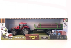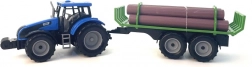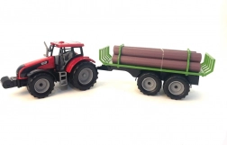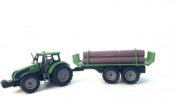 Przyczepa załadowana kłodami i różne kolory traktora zapewniają zabawę przy odgrywaniu scenariuszy rolniczych i budowlanych.
