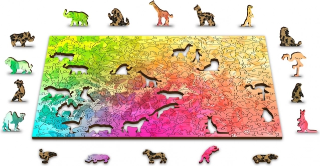 Puzzle zawiera elementy w kształcie zwierząt i przedmiotów, które można używać jako małe figurki.
