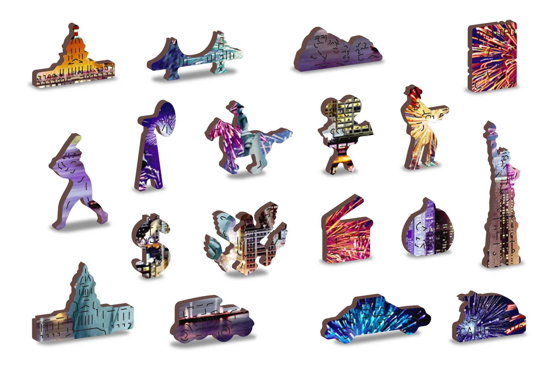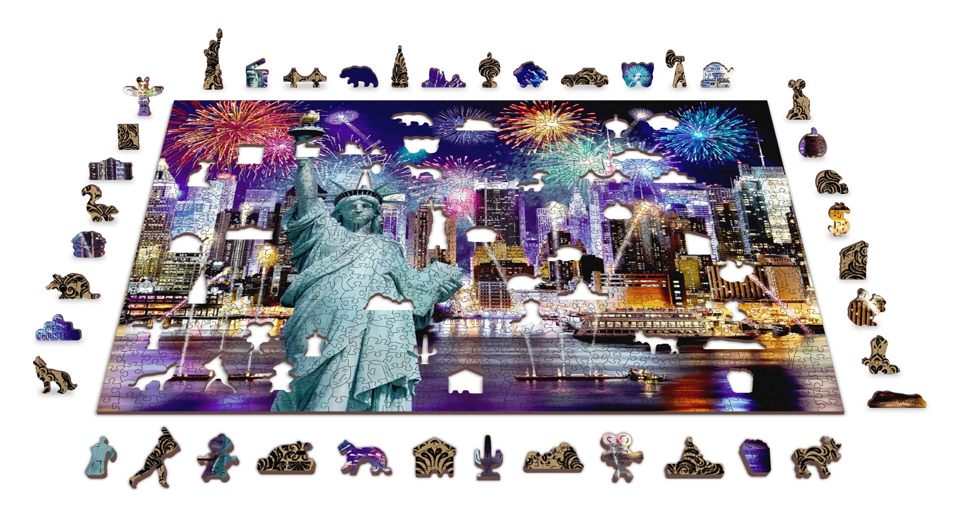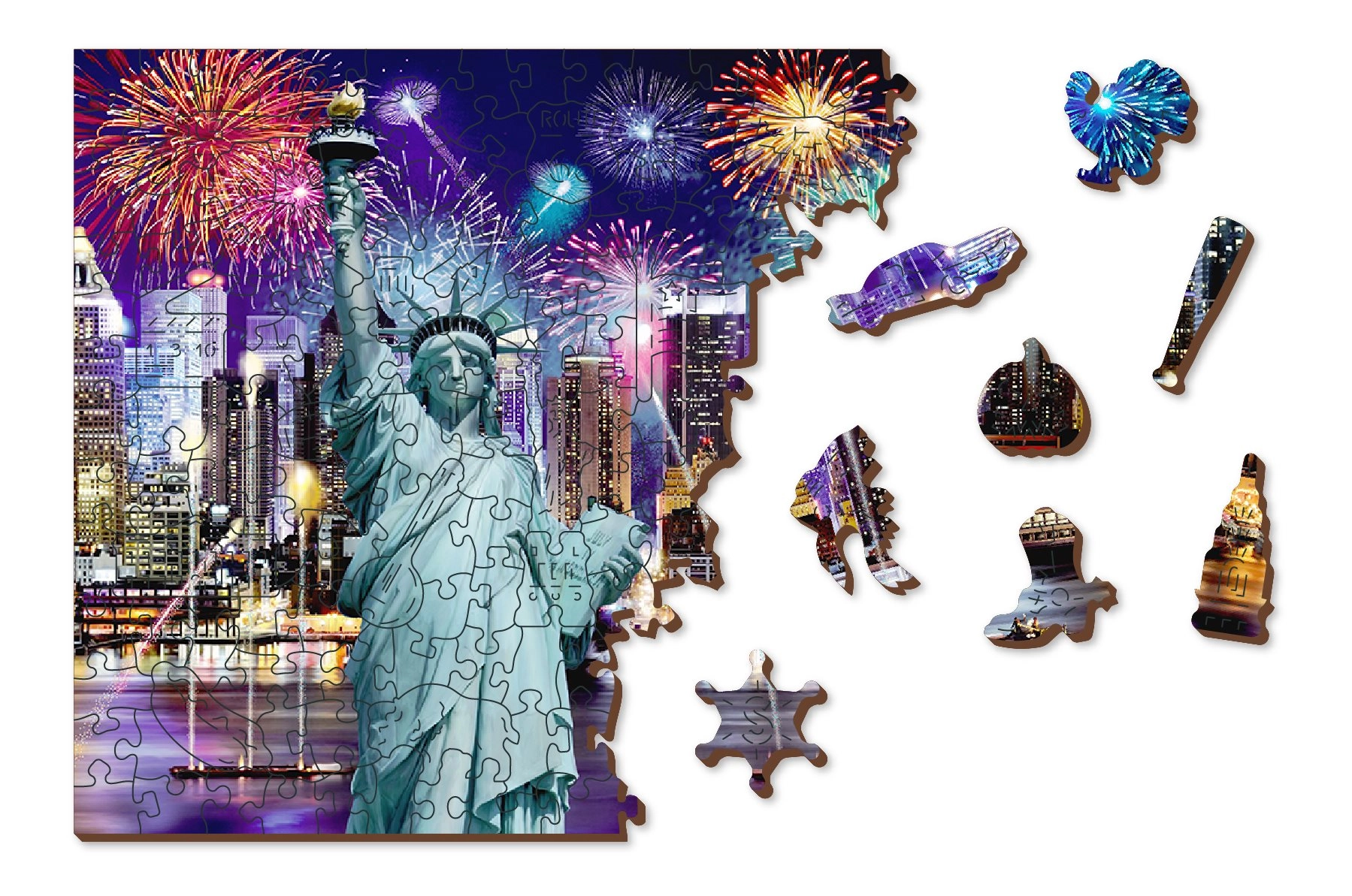 Wyrusz do Nocnego Nowego Jorku z naszym luksusowym drewnianym puzzlem 2w1. Starannie wycinane z precyzyjnego materiału, te puzzle oferują unikalne kształtowane elementy, które samodzielnie tworzą zwierzęta, obiekty lub budynki, a przy tym pozostają przyjazne dla środowiska.