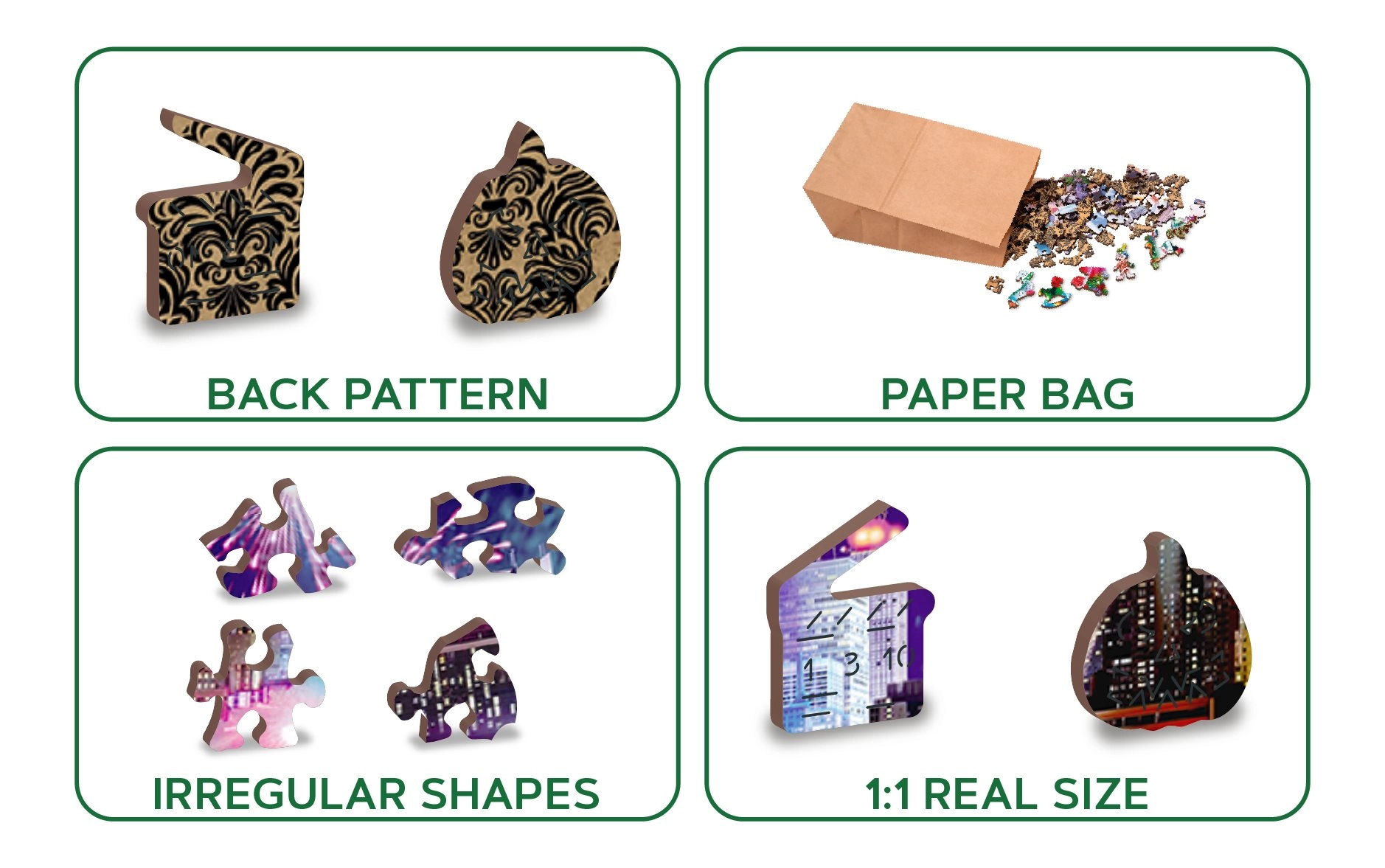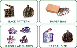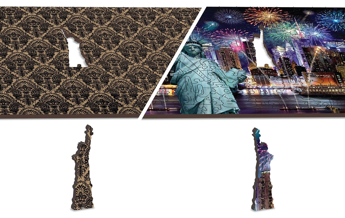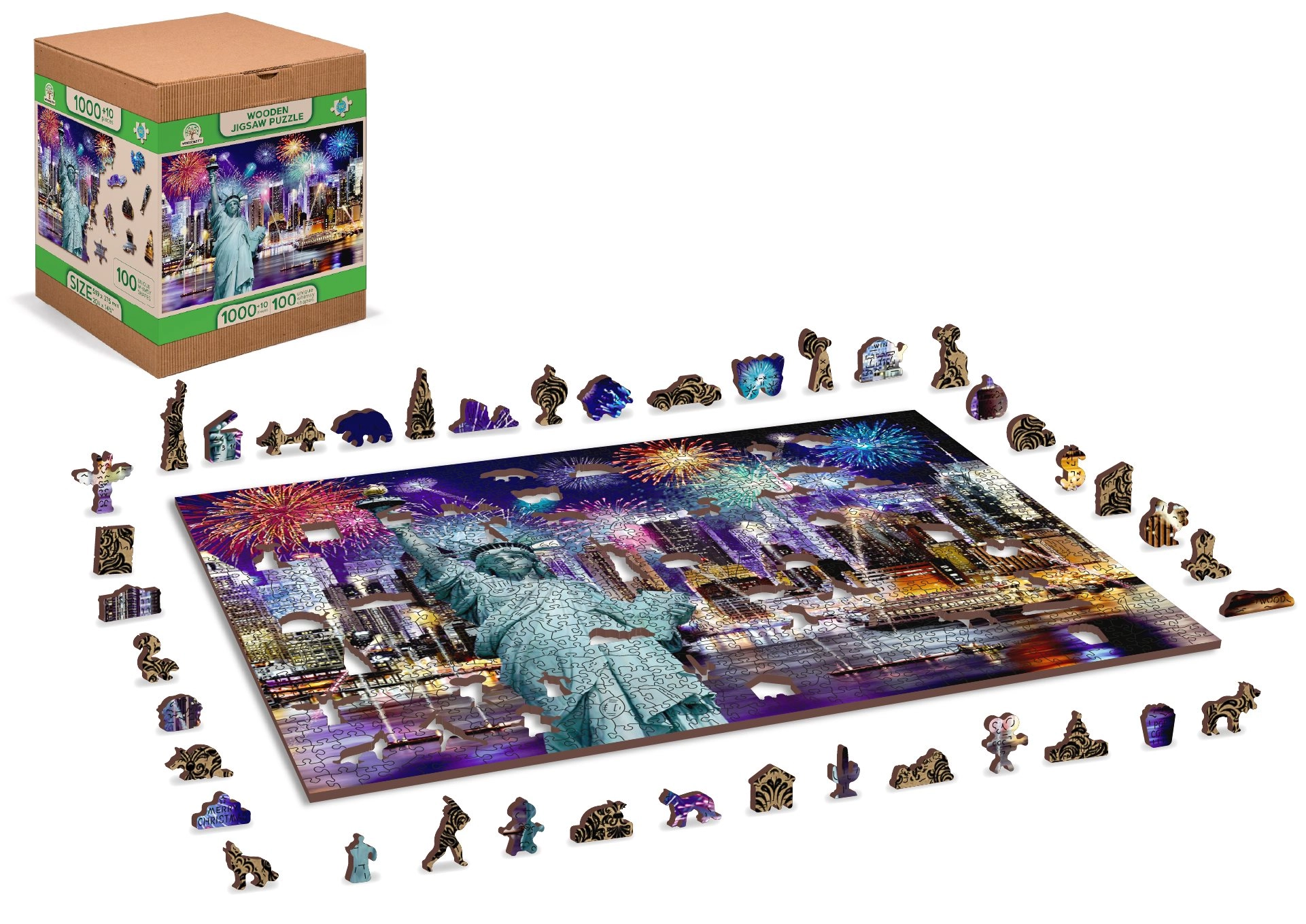 Wyrusz do Nocnego Nowego Jorku z naszym luksusowym drewnianym puzzlem 2w1. Starannie wycinane z precyzyjnego materiału, te puzzle oferują unikalne kształtowane elementy, które samodzielnie tworzą zwierzęta, obiekty lub budynki, a przy tym pozostają przyjazne dla środowiska.