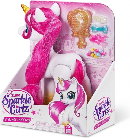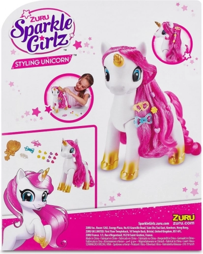 Jednorożec Sparkle Girlz ma piękny design i urocze elementy, takie jak duże oczy oraz długie, kolorowe włosy.
