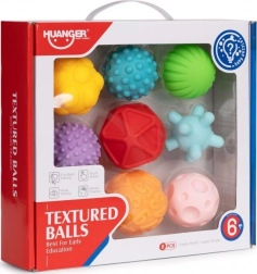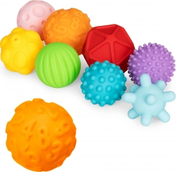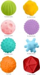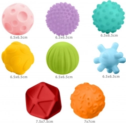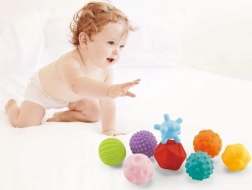 Ten kolorowy zestaw dostarcza niemowlętom i maluchom wielu odkryć – każda piłeczka ma inną teksturowaną powierzchnię, rozmiar i kolor, dzięki czemu dzieci naturalnie rozwijają chwyt, koordynację oko–ręka oraz percepcję kształtów. Miękki silikon jest przyjemny w dotyku, a piłeczki łatwo się ściska małymi rączkami.