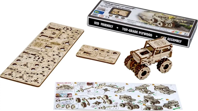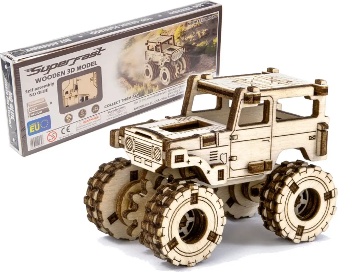 Odkryj radość z budowania dzięki drewnianym puzzlom 3D, które pozwolą Ci stworzyć własny model monster trucka inspirowanego kultowym SUV-em TOYOTA FJ40. Zestaw nie wymaga kleju ani śrub, więc montaż jest czysty i szybki. Dzięki łatwemu składaniu, 64 elementom, krótkiemu czasowi montażu (ok. 30 minut) oraz ekologicznemu wykonaniu bez plastiku to świetny wybór dla początkujących i zaawansowanych. Model z sklejki brzozowej możesz dodatkowo pomalować według własnych upodobań.