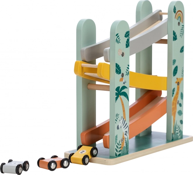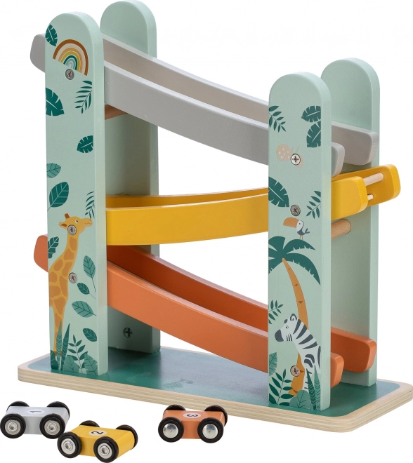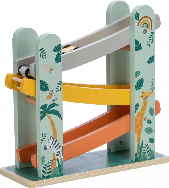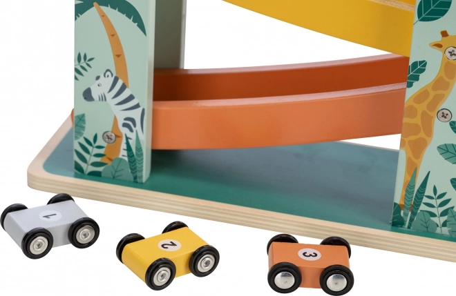 Przedstawiamy wspaniały drewniany tor wyścigowy z trzema autkami! Skorzystaj z kolorowej odmiany trasy i obserwuj, jak Twoje dzieci z entuzjazmem oglądają, jak autka wykonują akrobacje z jednego piętra na drugie. Tor został uzupełniony o piękne ilustracje z motywami zwierzęcymi, co nadaje mu zabawowy charakter. Autka mają gumowe koła dla stabilnej jazdy i dwustronny design.