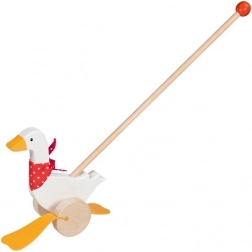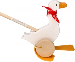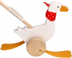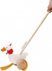 Dziecięca gęś Berta z wysokiej jakości drewna zachwyca klasycznym wzornictwem z czerwonym szalikiem w grochy i wyraźnymi „płetwiastymi” nóżkami, które uroczo poruszają się podczas pchania. Długa rączka ułatwia prowadzenie zabawki i wspiera aktywność ruchową dzieci.