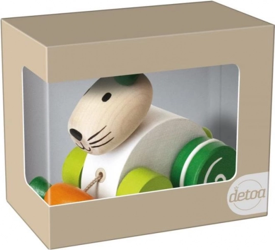 Urocza zabawka do ciągnięcia w kształcie królika z marchewką wesprze pierwsze kroki Twojego dziecka. Dzięki prostemu ciągnięciu na sznurku motywuje do ruchu i rozwija motorykę. W zestawie znajduje się eko naturalne opakowanie – świetny prezent dla małych odkrywców.