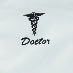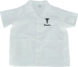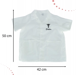 Biały lekarski płaszcz z krótkimi rękawami, dwiema kieszeniami i symbolem kaduceusza z napisem 'Doctor'.