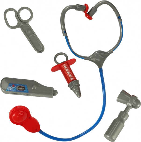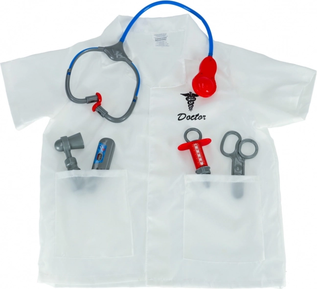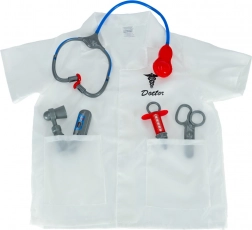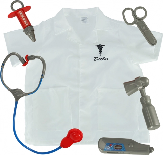 Zawiera lekarski płaszcz i narzędzia medyczne: stetoskop, nożyczki, strzykawkę, termometr i młotek neurologiczny.