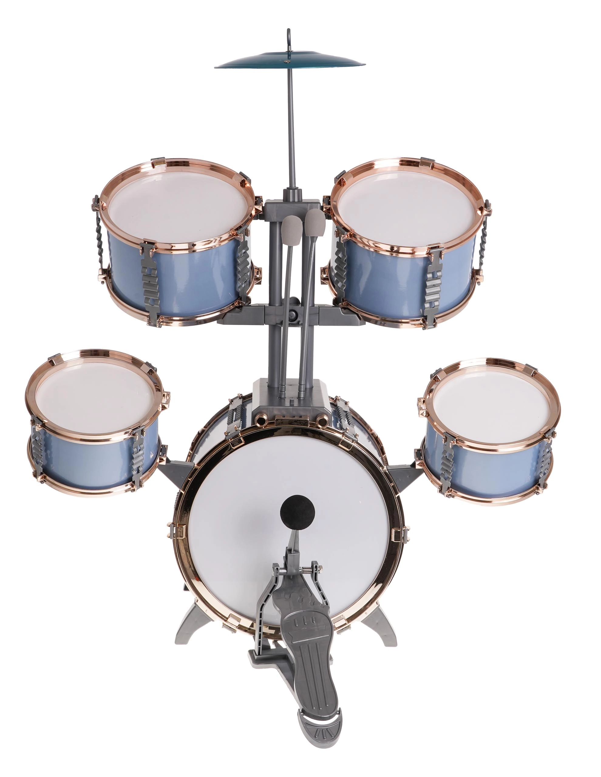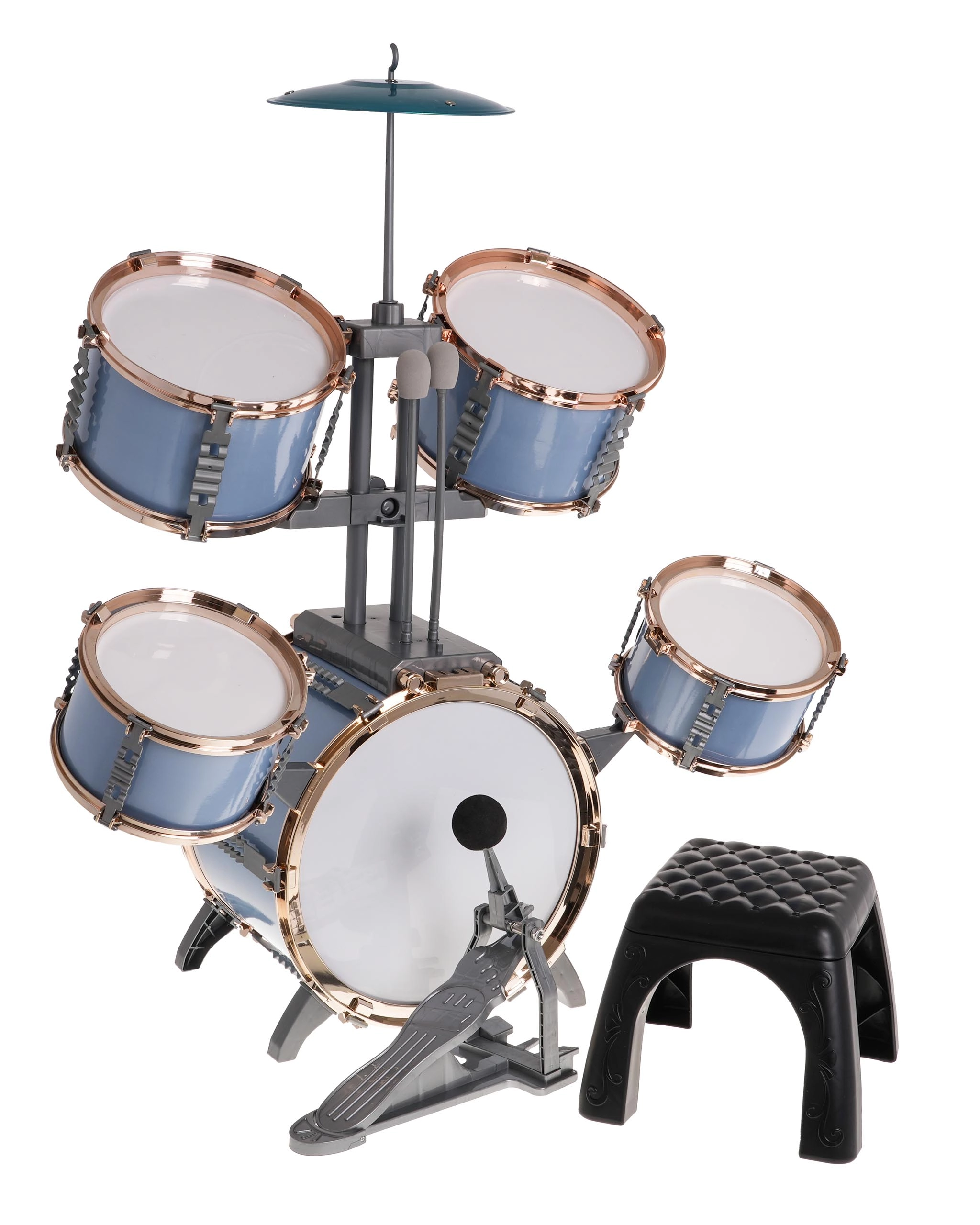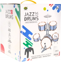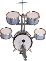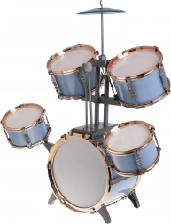 - Bęben basowy z pedałem, 2× bęben średni, 2× bęben mały, metalowy talerz, 2× pałeczka, stołek