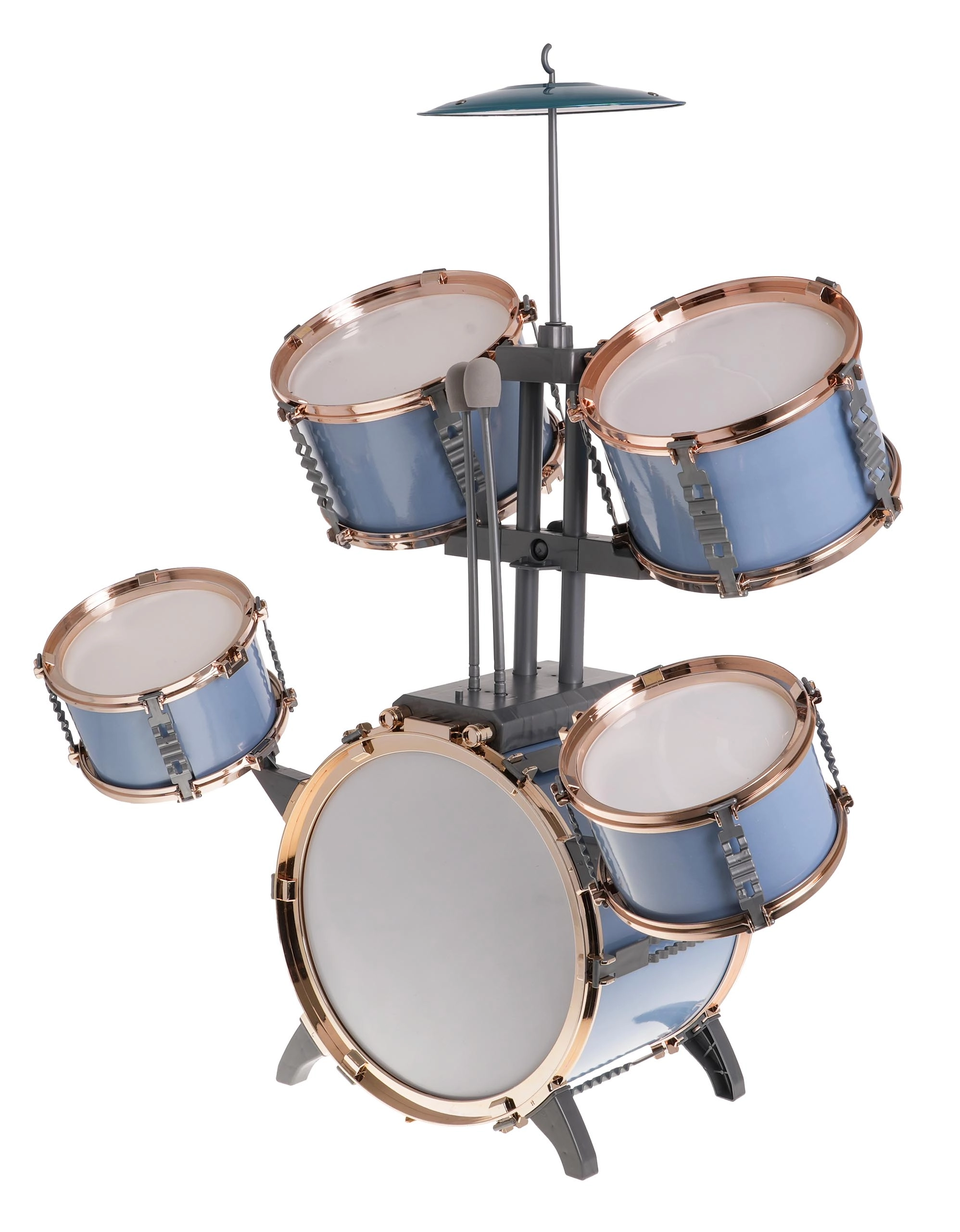 Ten pięcioczęściowy dziecięcy zestaw perkusyjny w błękitnym kolorze to świetny wybór na pierwsze spotkanie z muzyką. Oferuje autentyczne wrażenia z gry na perkusji, w tym duży bęben basowy z pedałem, dwa średnie i dwa małe bębny oraz jasno brzmiący metalowy talerz.
