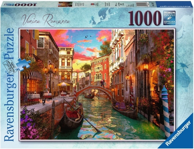 Ciesz się spokojną atmosferą włoskich uliczek z wysokiej jakości puzzlami RAVENSBURGER. Obraz Romantyczna Wenecja w wersji 1000 elementów oferuje precyzyjne wykonanie, idealne dopasowanie elementów oraz jedwabisty, matowy efekt dla wygodnego układania.
