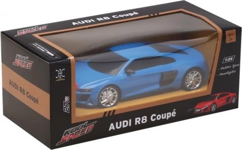 Niebieskie Audi R8 Coupé jest zapakowane w czarne pudełko z przezroczystym okienkiem, co umożliwia dokładny wgląd na model.
