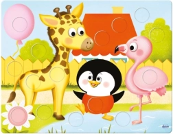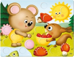 - Zawiera kartonową planszę, kolorowe drewniane walce i kostkę do gry.