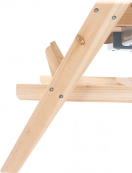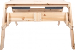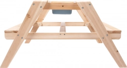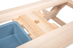 Drewniany stół służy jako stolik piknikowy i powierzchnia do zabawy z wanienkami na piasek lub wodę.