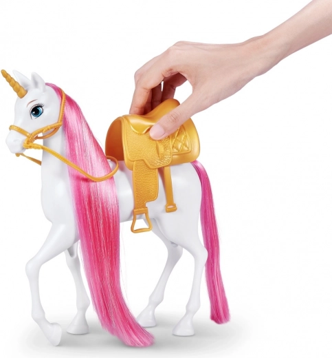 Biały jednorożec ze złotym siodłem oraz różową grzywą i ogonem zachęca do czesania i stylizacji – idealny do rozwijania kreatywności.