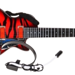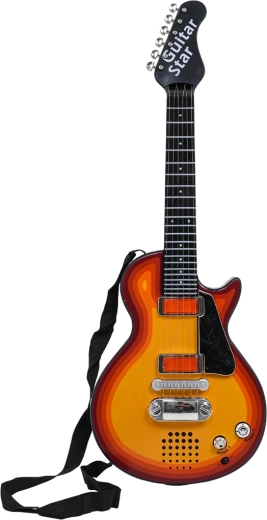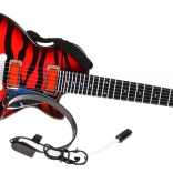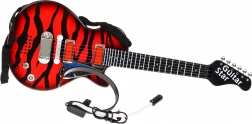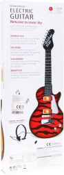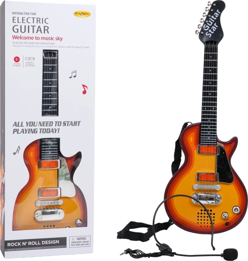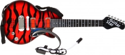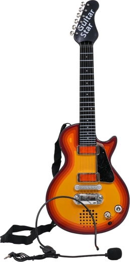 Ta dziecięca gitara elektryczna to doskonały wybór dla małych rockmanów i rockmanek. Umożliwia zarówno odtwarzanie gotowego rockowego podkładu, jak i własną grę – po dotknięciu metalowych strun gitara wydaje dźwięk. Dołączony zestaw słuchawkowy z mikrofonem podłącza się bezpośrednio do gitary, dzięki czemu dziecko może jednocześnie śpiewać i grać.