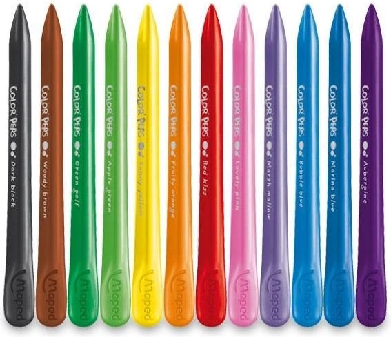Odkryj trójkątne plastikowe kredki MAPED Color'Peps PlastiClean w zestawie 12 szt.. Podwójne zakończenie – szpic do precyzyjnych linii oraz płaski koniec do dużych powierzchni. Kredki nie pozostawiają śladów na dłoniach, łatwo się temperują i trwają nawet 3× dłużej niż standardowe kredki woskowe.