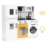 Ta stylowa dziecięca kuchnia w biało‑drewnianym stylu wiernie naśladuje prawdziwą kuchnię. Dzięki świecącym palnikom i dźwiękom gotowania po naciśnięciu czerwonych przycisków zabawa jest jeszcze bardziej wciągająca. Otwierane drzwiczki w lodówce, piekarniku, mikrofalówce i pralce, obrotowe pokrętła kuchenki oraz „dyspenser wody” z bulgoczącym dźwiękiem wspierają realistyczne scenariusze zabawy.