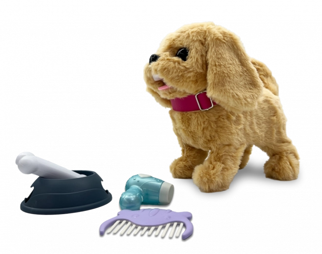 - Pluszowy piesek Alík (beżowy), grzebyk, miseczka, kosteczka