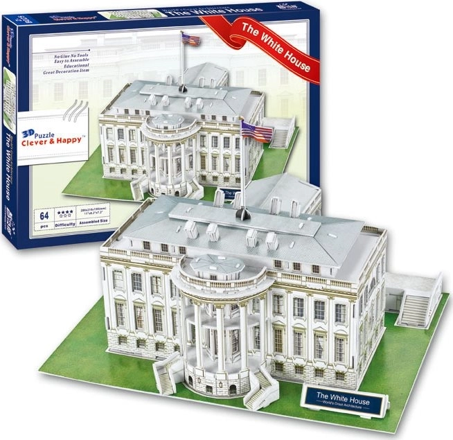 Clever&Happy 3D puzzle Biały Dom to perfekcyjna replika kultowej siedziby prezydenta Stanów Zjednoczonych, którą możecie złożyć bez użycia nożyczek i kleju. Ta szczegółowa 3D replika przynosi wymagające wyzwanie z trudnością na poziomie 4,7 punktu, które pokochają wszyscy pasjonaci architektury i budynków.
