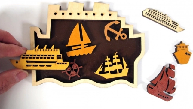 Kolorowe drewniane elementy w kształcie statków, kotwicy czy koła sterowego ułóż w precyzyjnie wyznaczonej przestrzeni. Świetne do treningu logiki i małej motoryki.